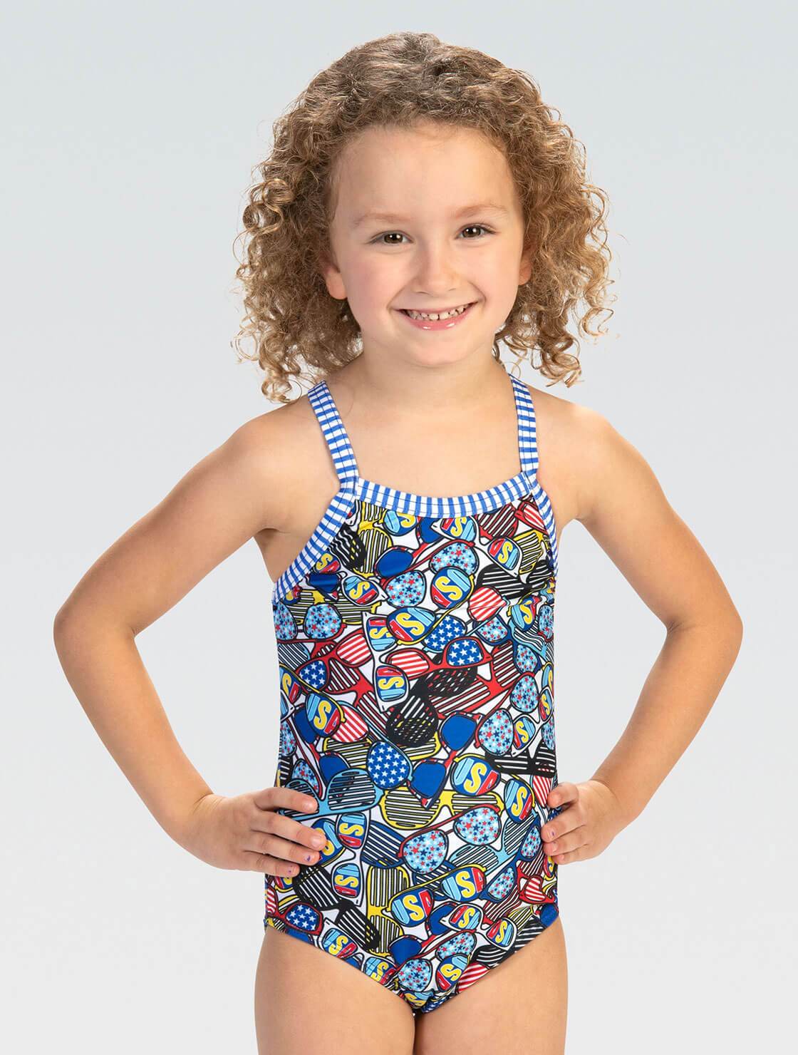 Give her all the confidence she needs for swim practice in this limited-edition United We Shade print. This one piece swimsuit features little sunglasses everywhere with USA in the reflection. So adorable for practice!